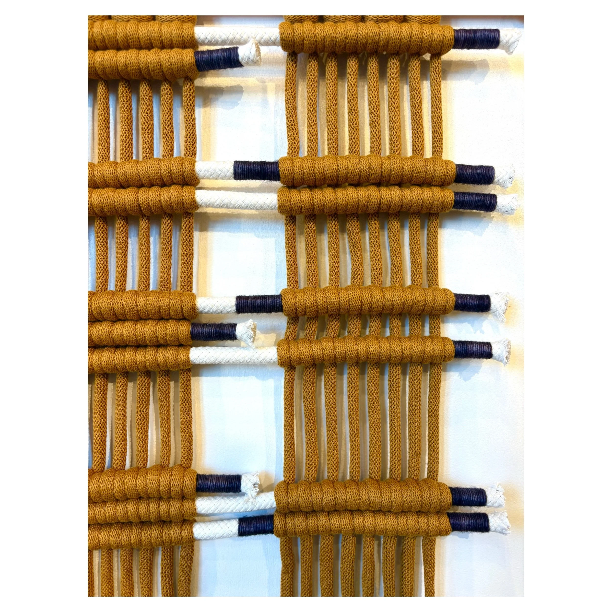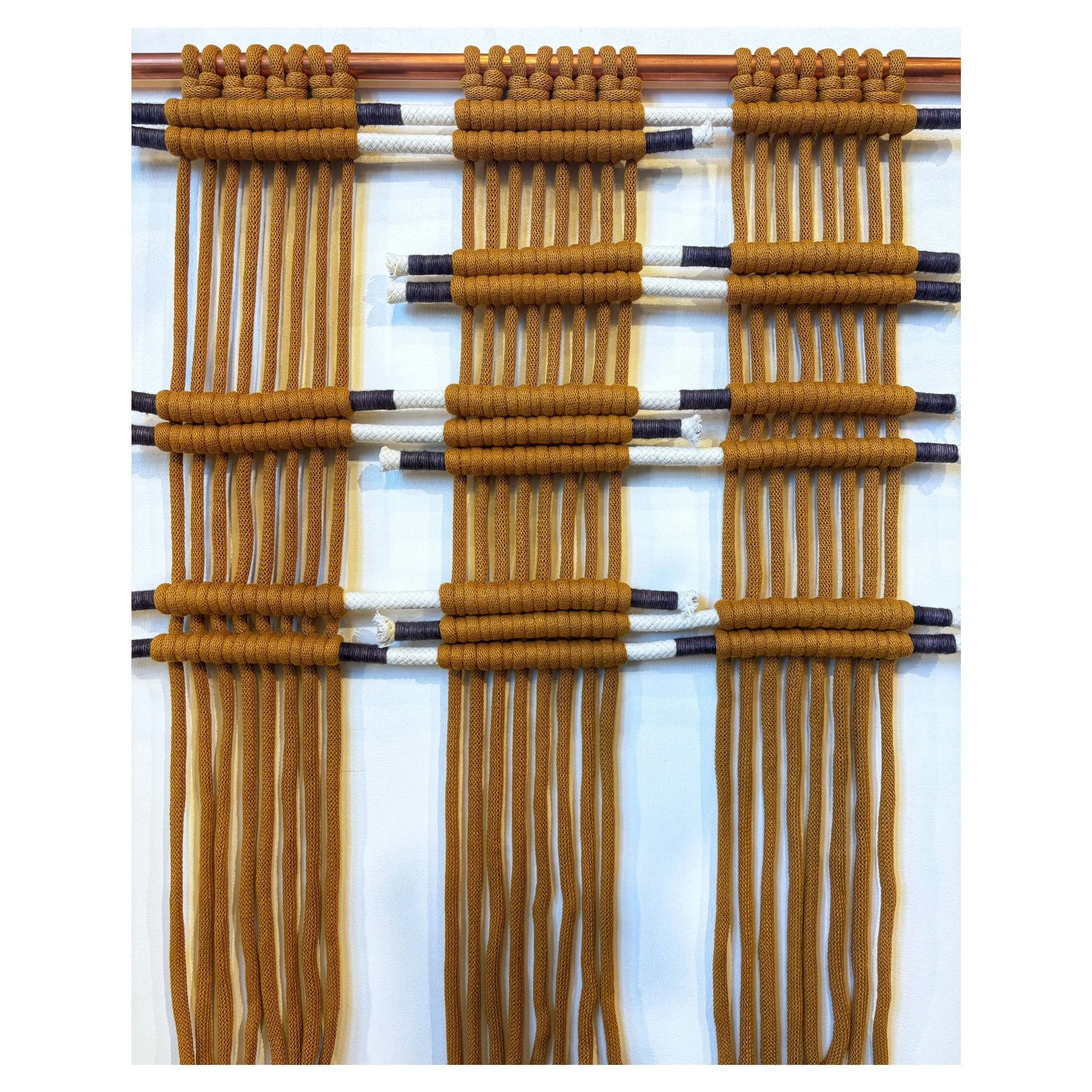 Modem fiber wall hanging made from mustard and white cotton braided cord with charcoal hand-wrapped accents. Hangs from copper pipe.