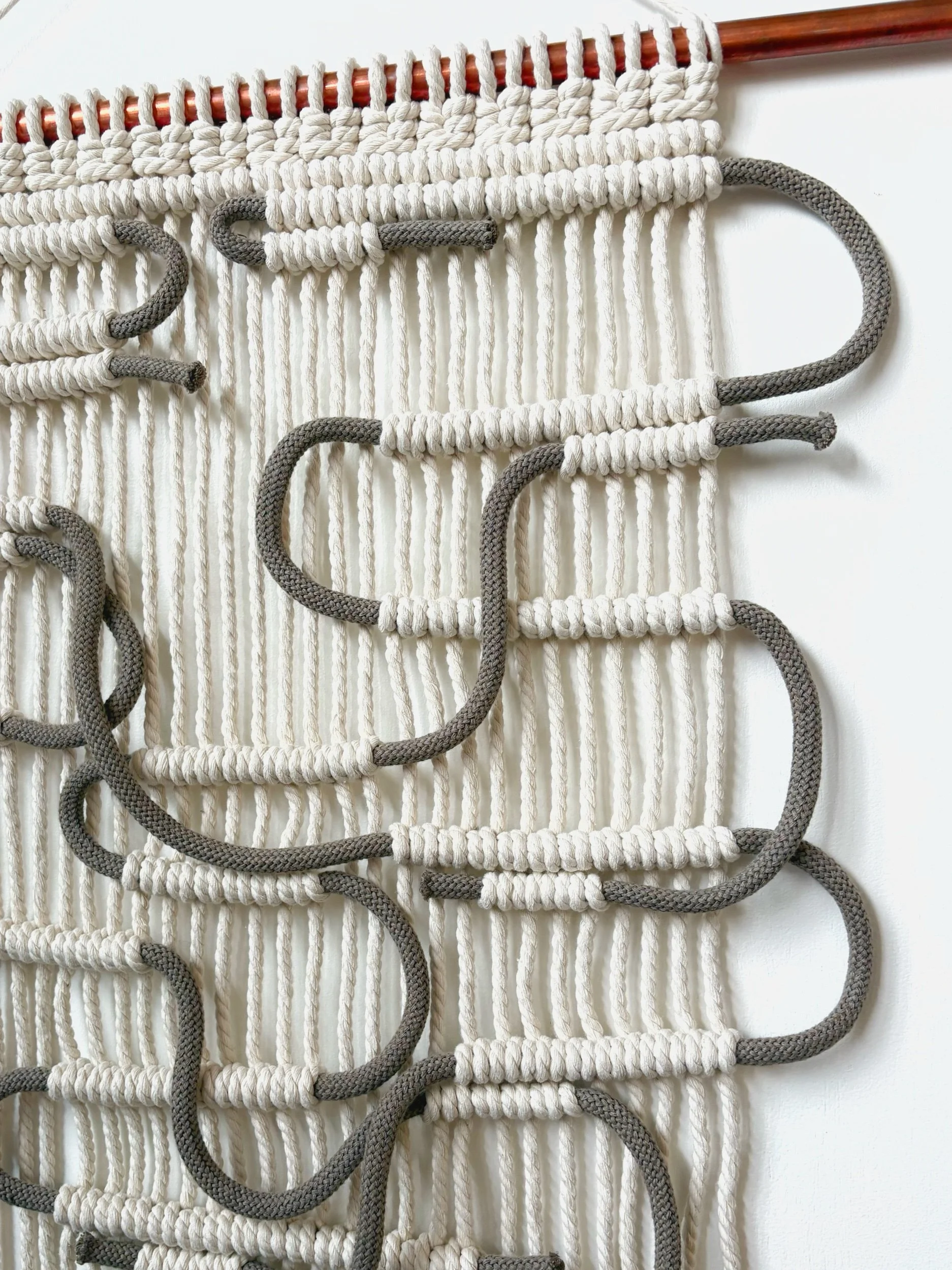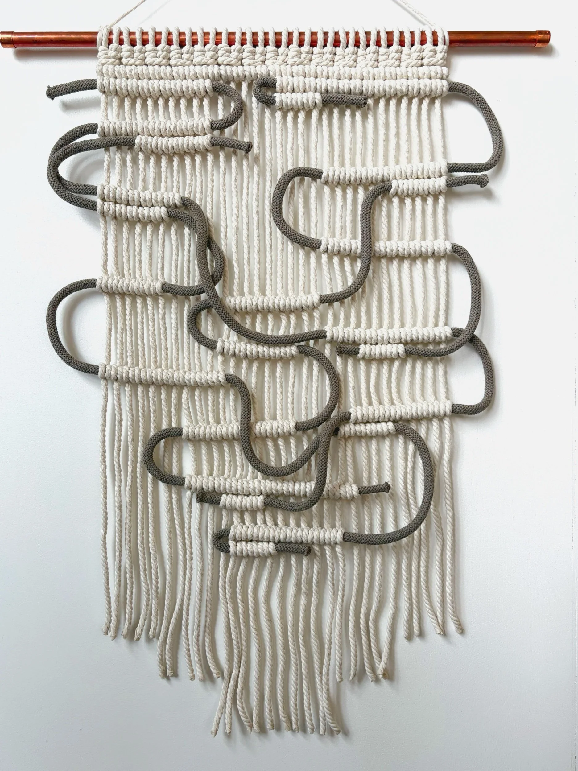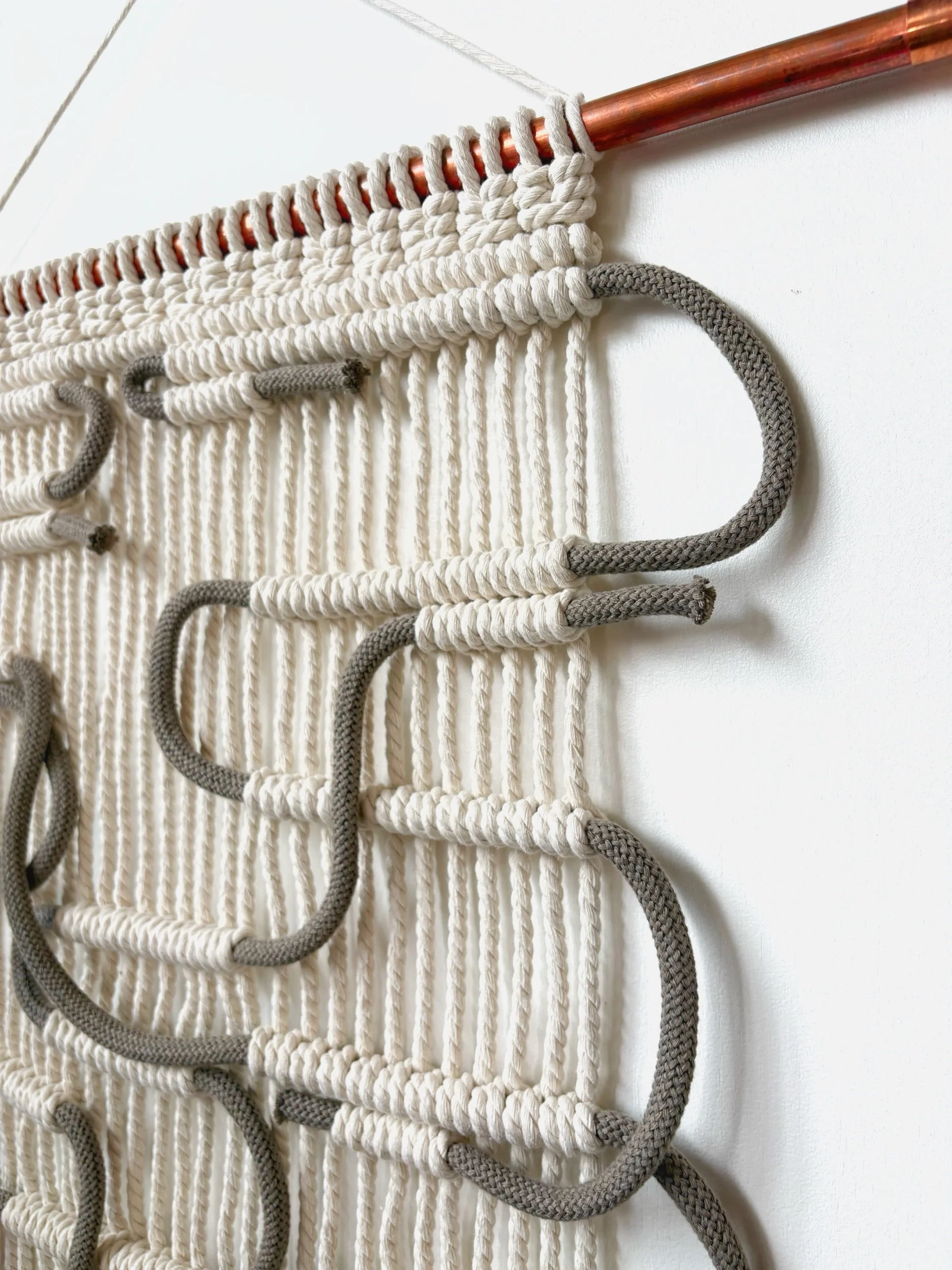 Macrame wall hanging. Taupe recycled cotton cord looped through natural cotton rope. Copper hanger.