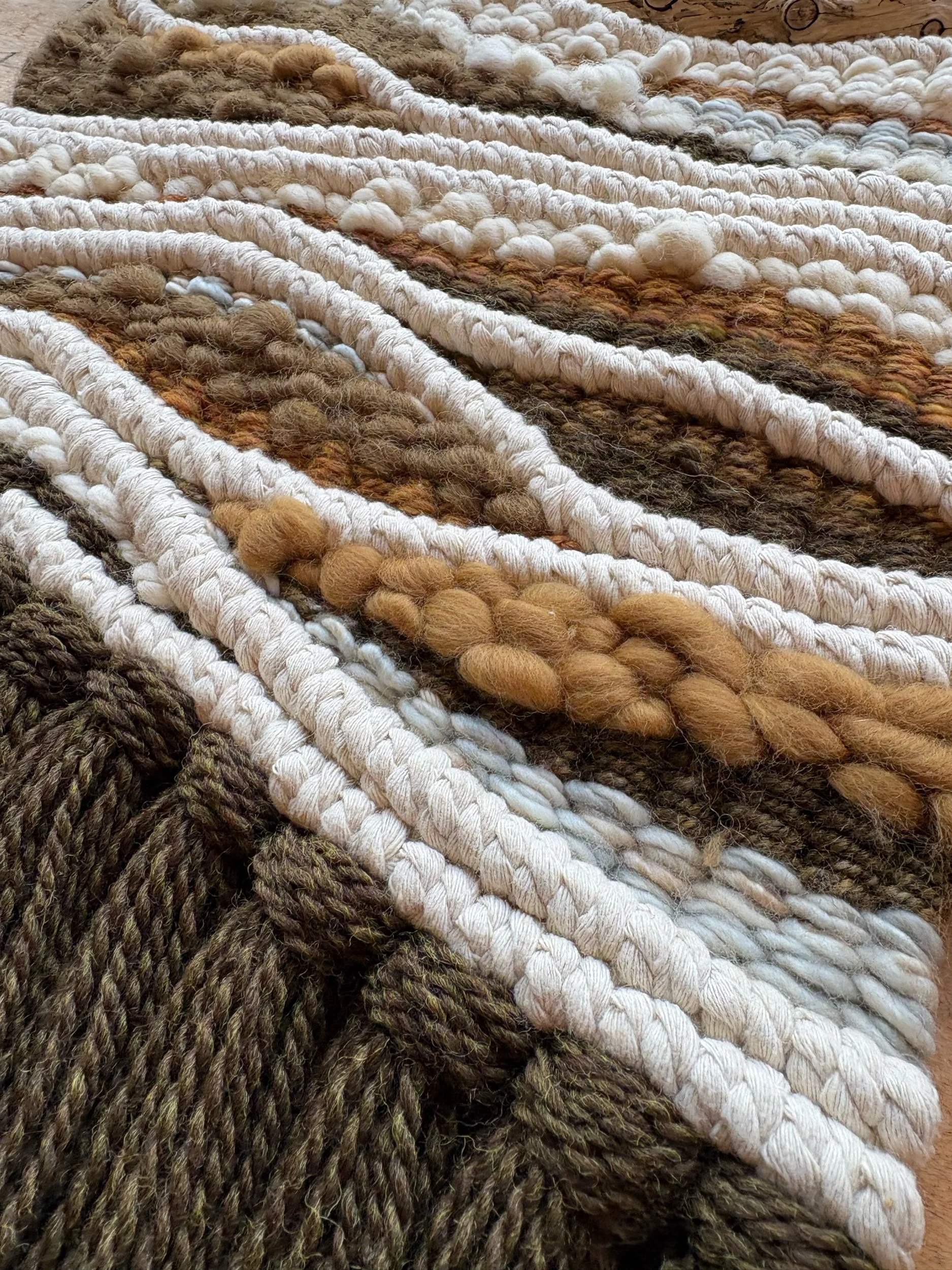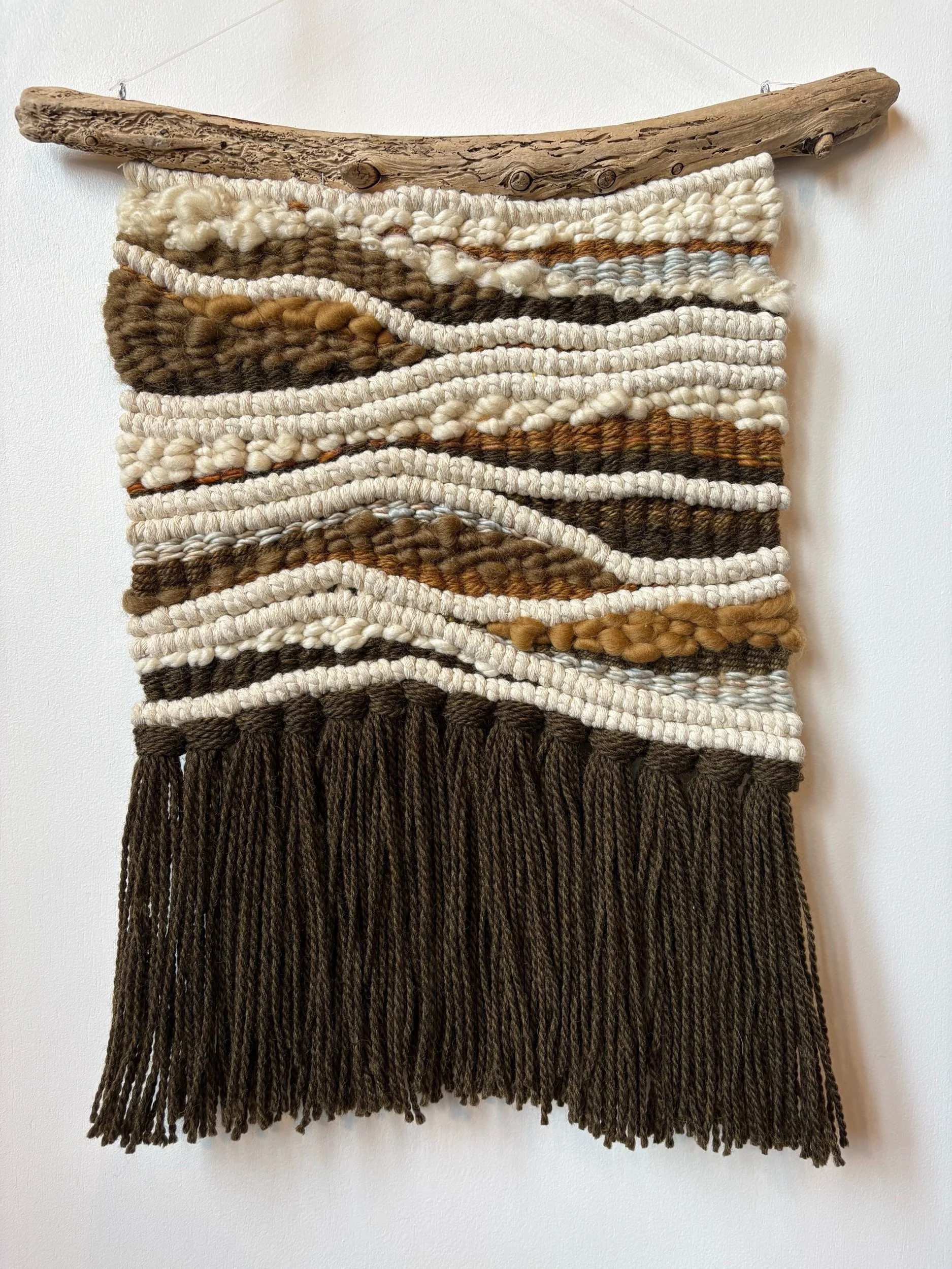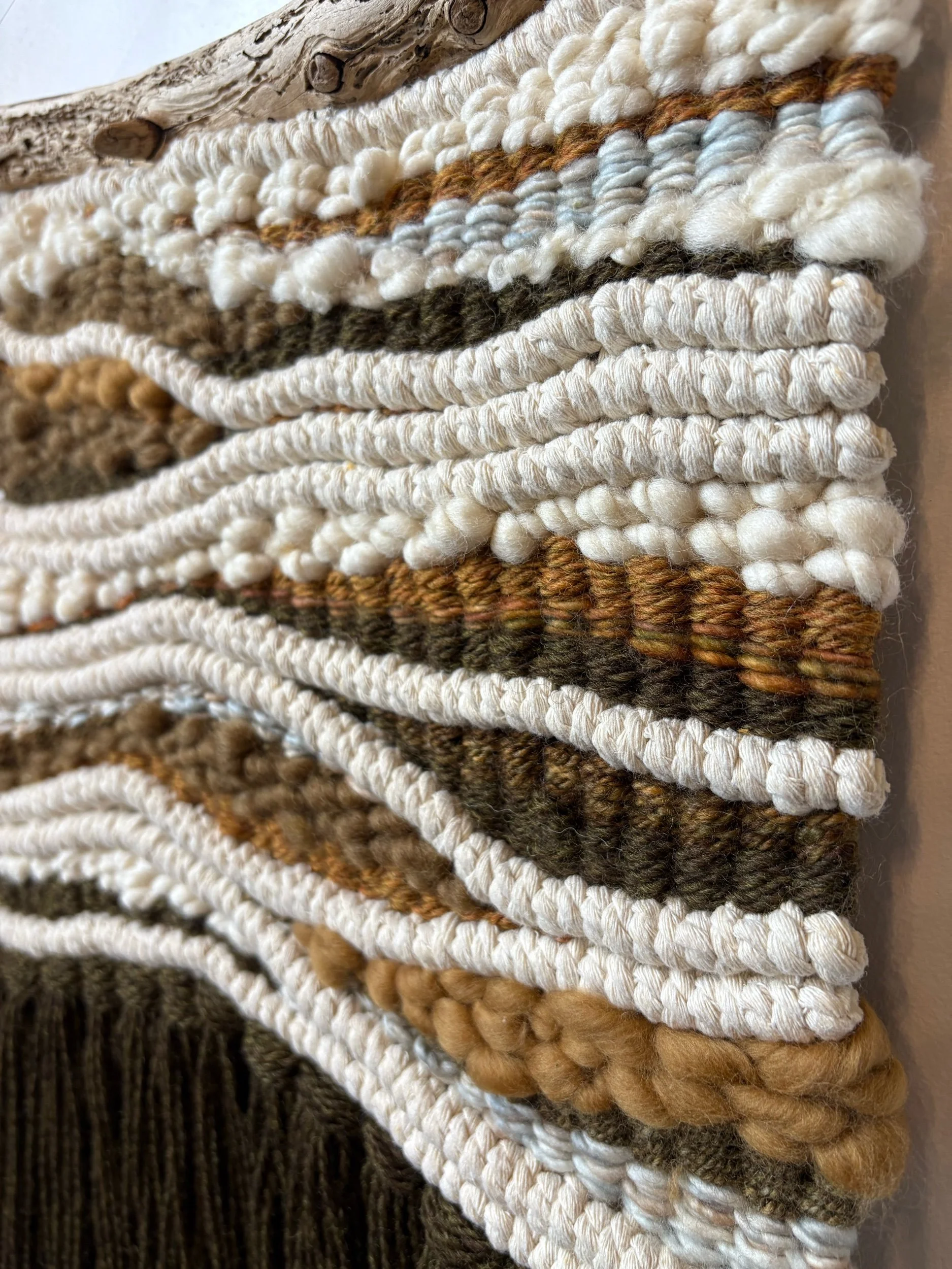 Macrame and weaving hybrid made from a mix of cotton and wool in warm earth tones and rich green fringe. Hangs from found wood.