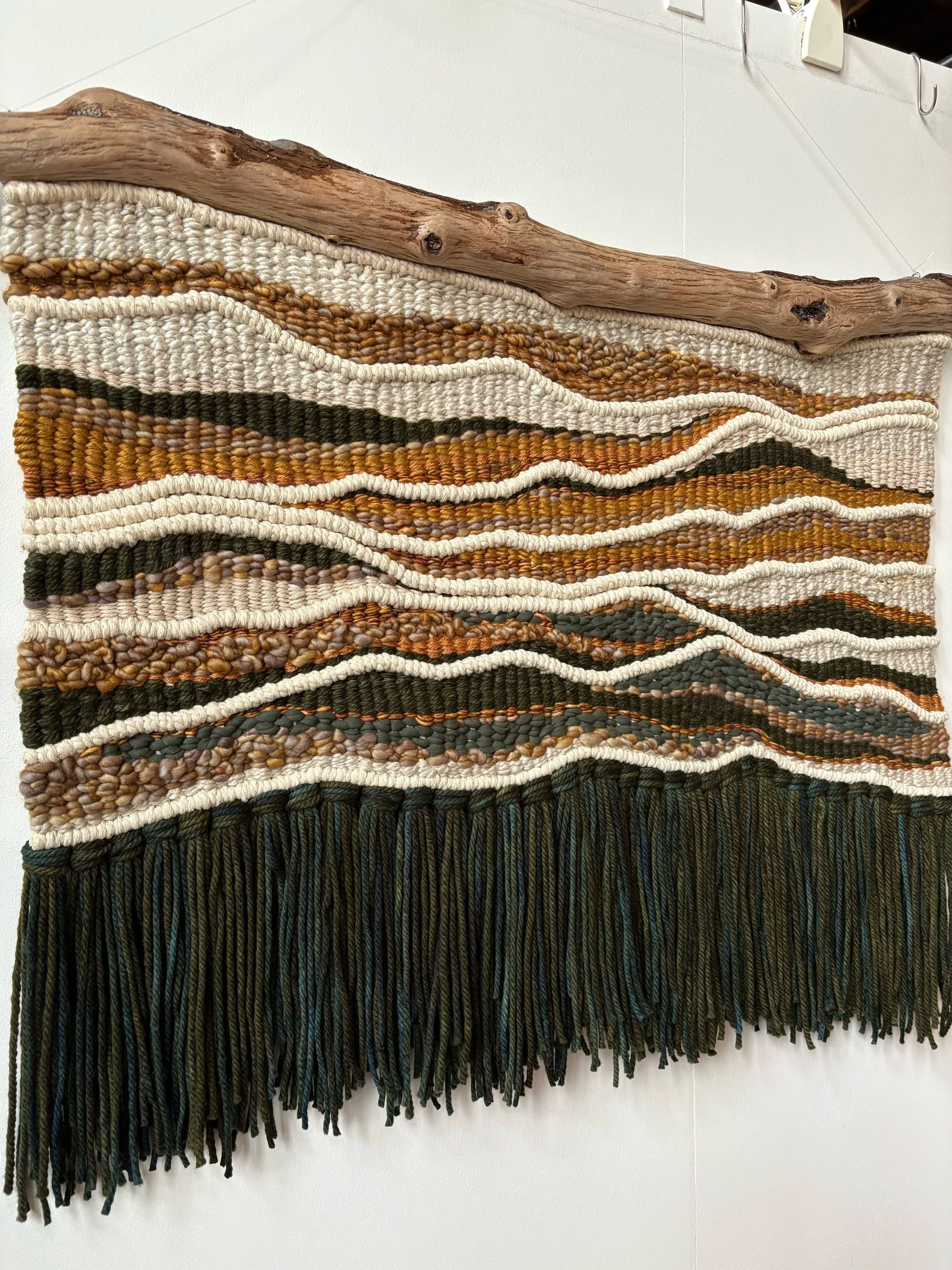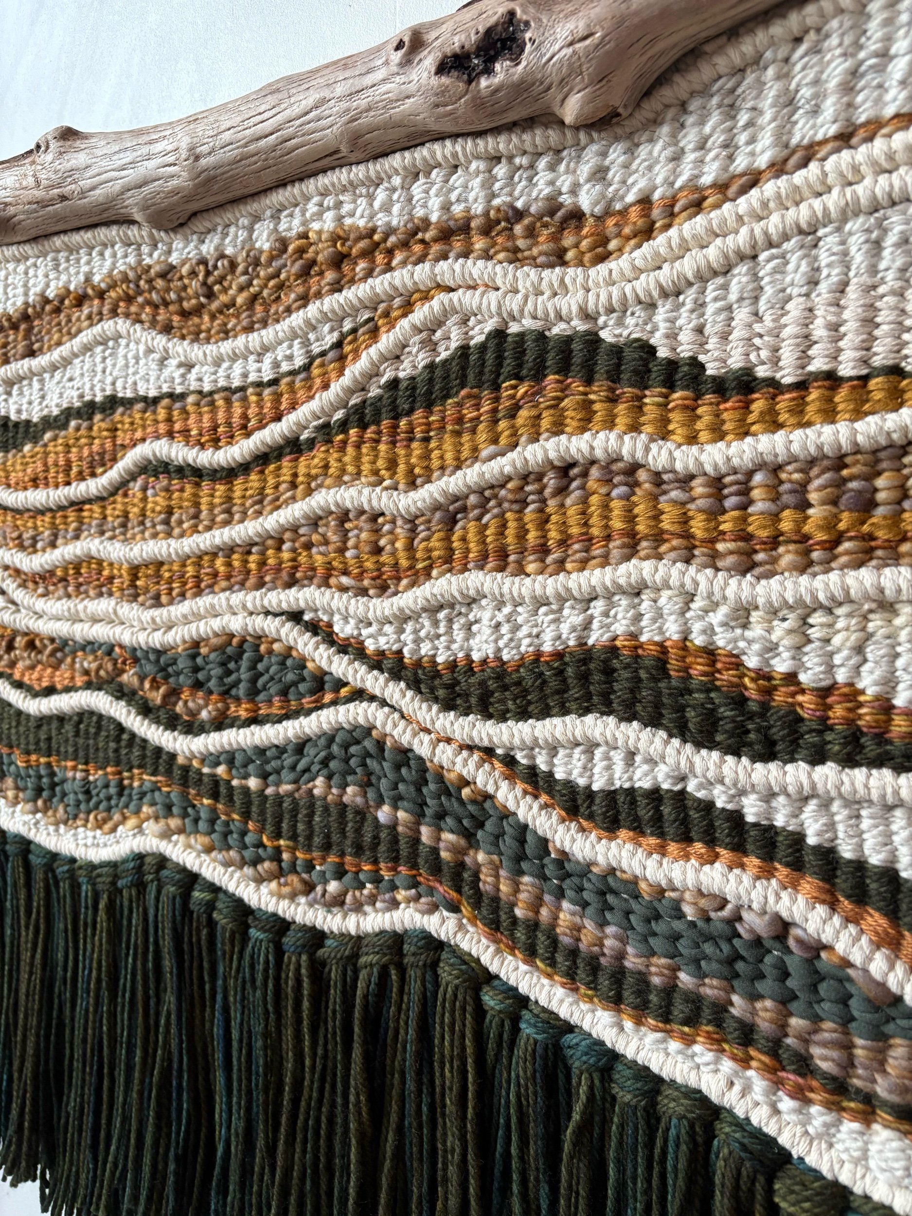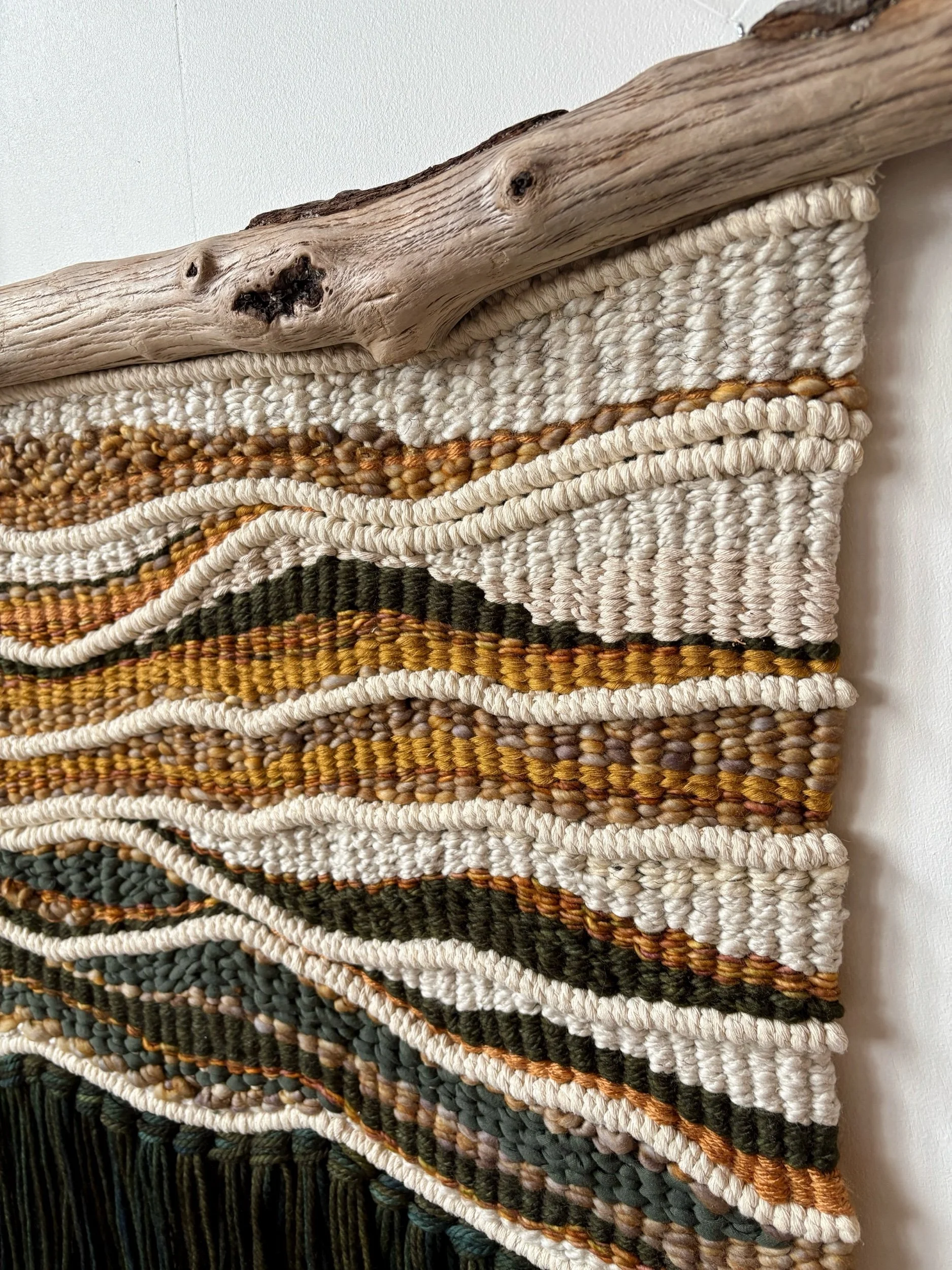 Woven wall hanging, made in a hybrid style of macrame and weaving. Golden earth tones with dark green fringe. Hangs from found wood.